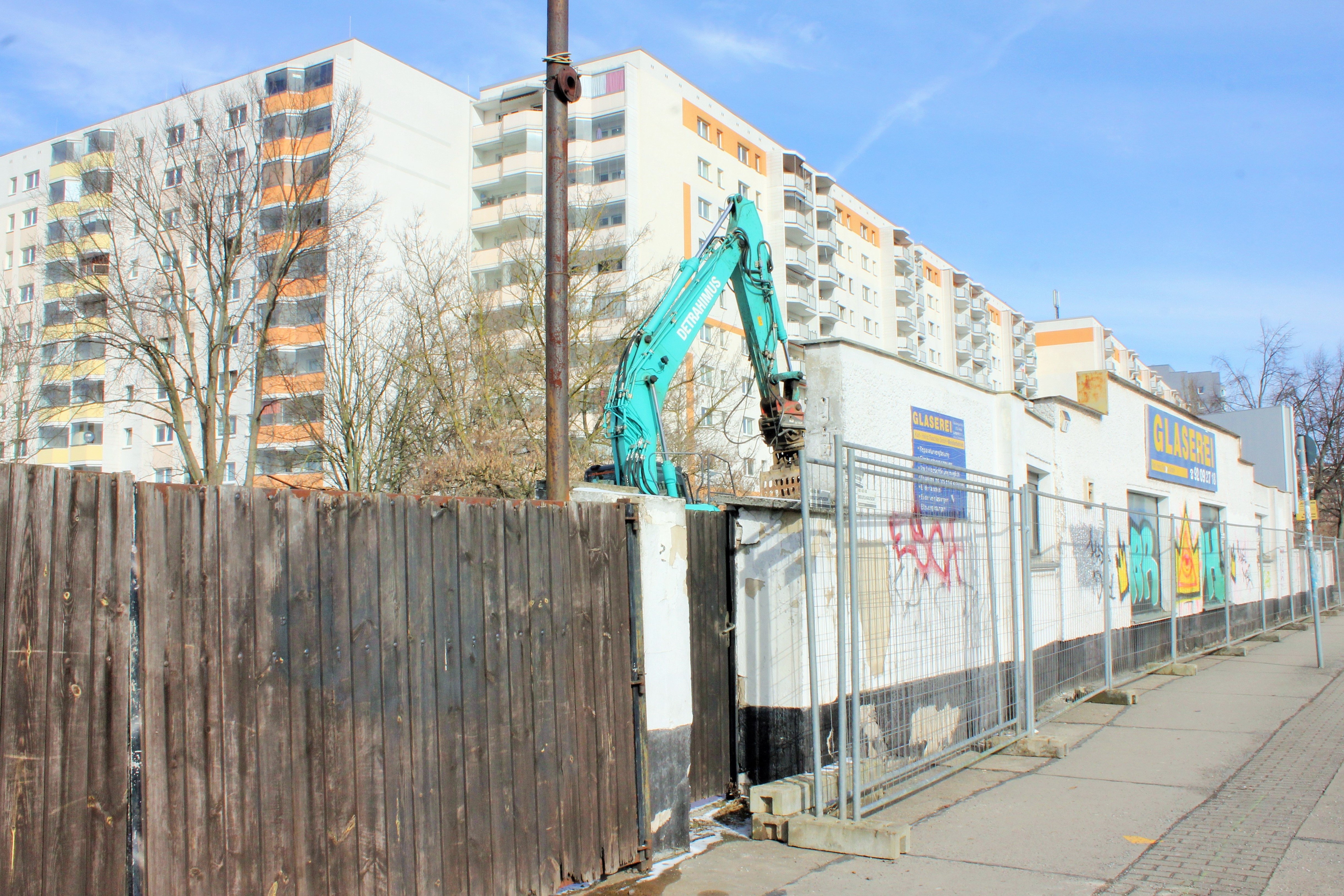 Hinter der straßenbegleitenden Fassade entlang der Falkenberger Chaussee reißt ein Bagger die dahinter liegende Bebauung ab.